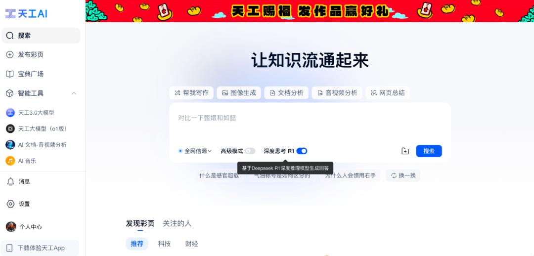「天工AI」接入DeepSeek R1模型,“联网搜索”无限次畅爽使用