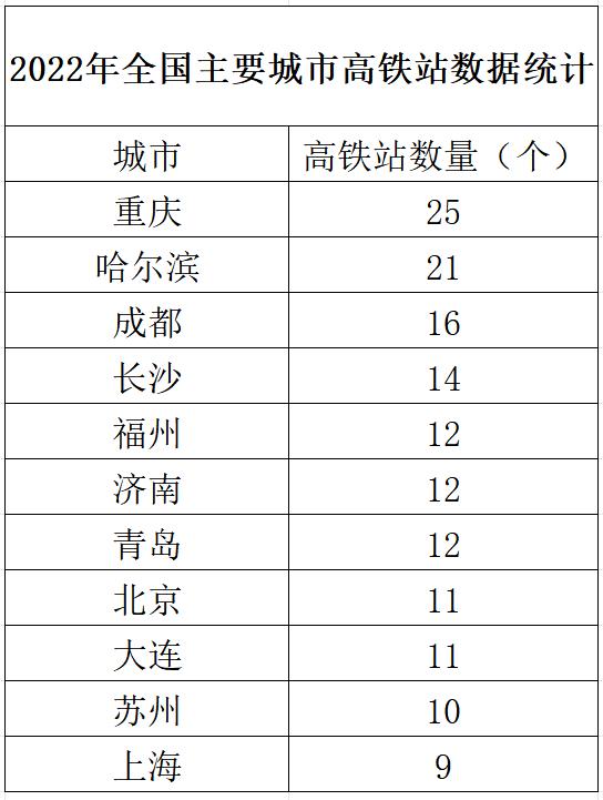 重庆作为我国西南腹地的一个运输中心,以25个高铁站位居榜首,作为东北门户城市的哈尔滨,竟然也有21个高铁站。