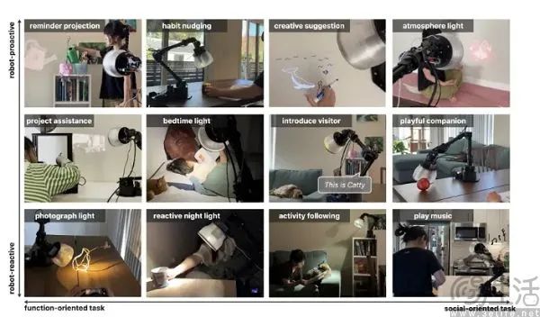 当然,以上种种围绕“照明”展开的功能,并非苹果这款台灯机器人最大的创新,它与以往桌面机器人最大的区别在于拥有表达“情感”的能力。例如当用户忙于工作时,台灯会像小狗一样“用头”将水杯推向用户;在用户询问天气时,台灯会先“看向”窗外、再给出答复;当用户边切菜边听音乐时,它则会跟随节奏舞动。