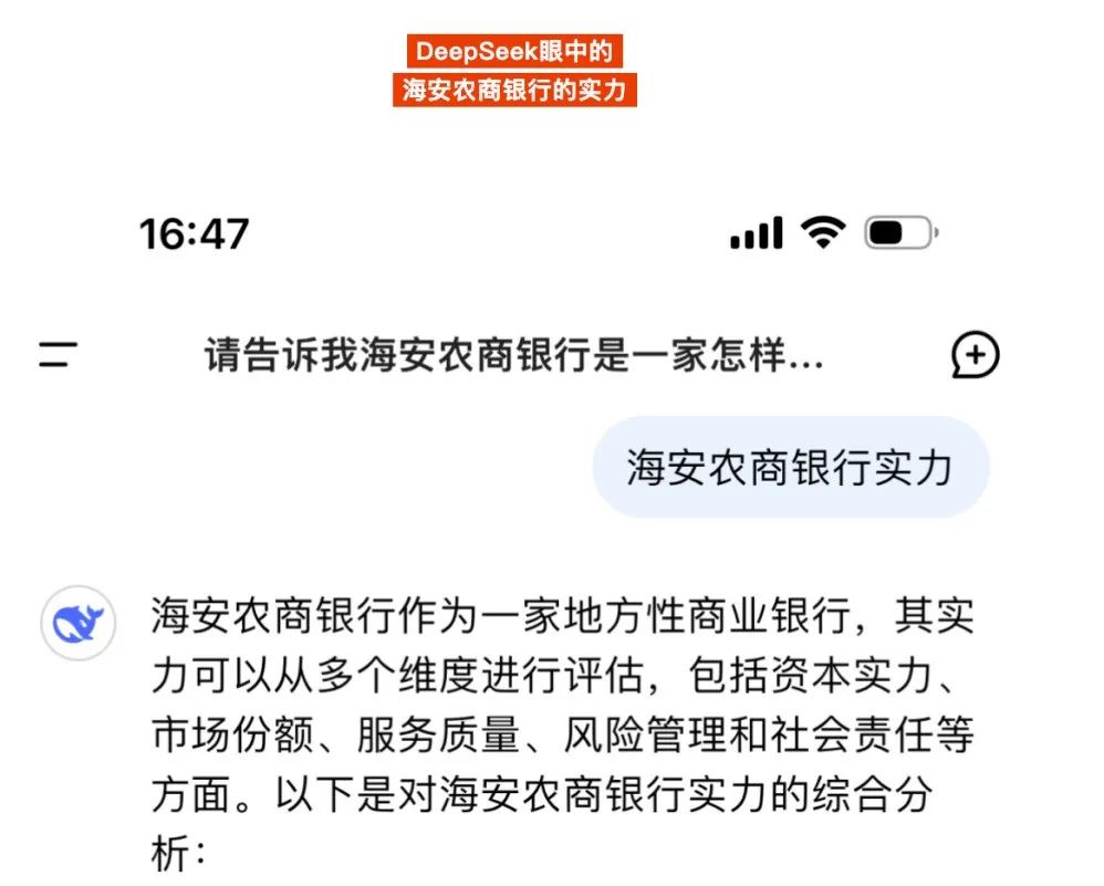 如,一些银行将DeepSeek的功能用在了营销过程中。“DeepSeek,你也太懂海安农商银行了吧!”在海安农商银行最近发布的一则文案中,该行就通过询问DeepSeek的方式向用户介绍了银行的具体情况,在文案中,DeepSeek从资本实力、市场份额、服务质量、金融产品、社会责任等多个维度对海安农商银行进行分析并做出总结。从银行的角度而言,业内多认为DeepSeek最直接的应用场景将覆盖智能客服、客户需求挖掘、风险评估与管理等层面。