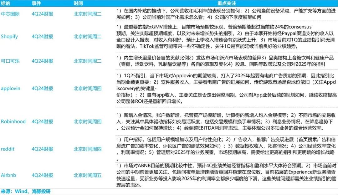 美股四季度财报季到本周已经到下半程,主要是一些垂直小龙头发布业绩。中国资产中,近期持续大涨的中芯国际打头,发布业绩。海豚君覆盖个股,以及重点关注点如下: