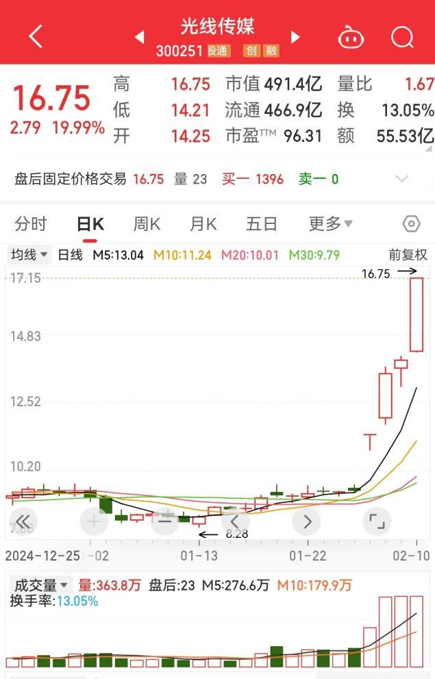 2月10日,《哪吒2》背后金主光线传媒,又直接“20CM”涨停收盘,开年四个交易日累计涨超75%,总市值直奔500亿。