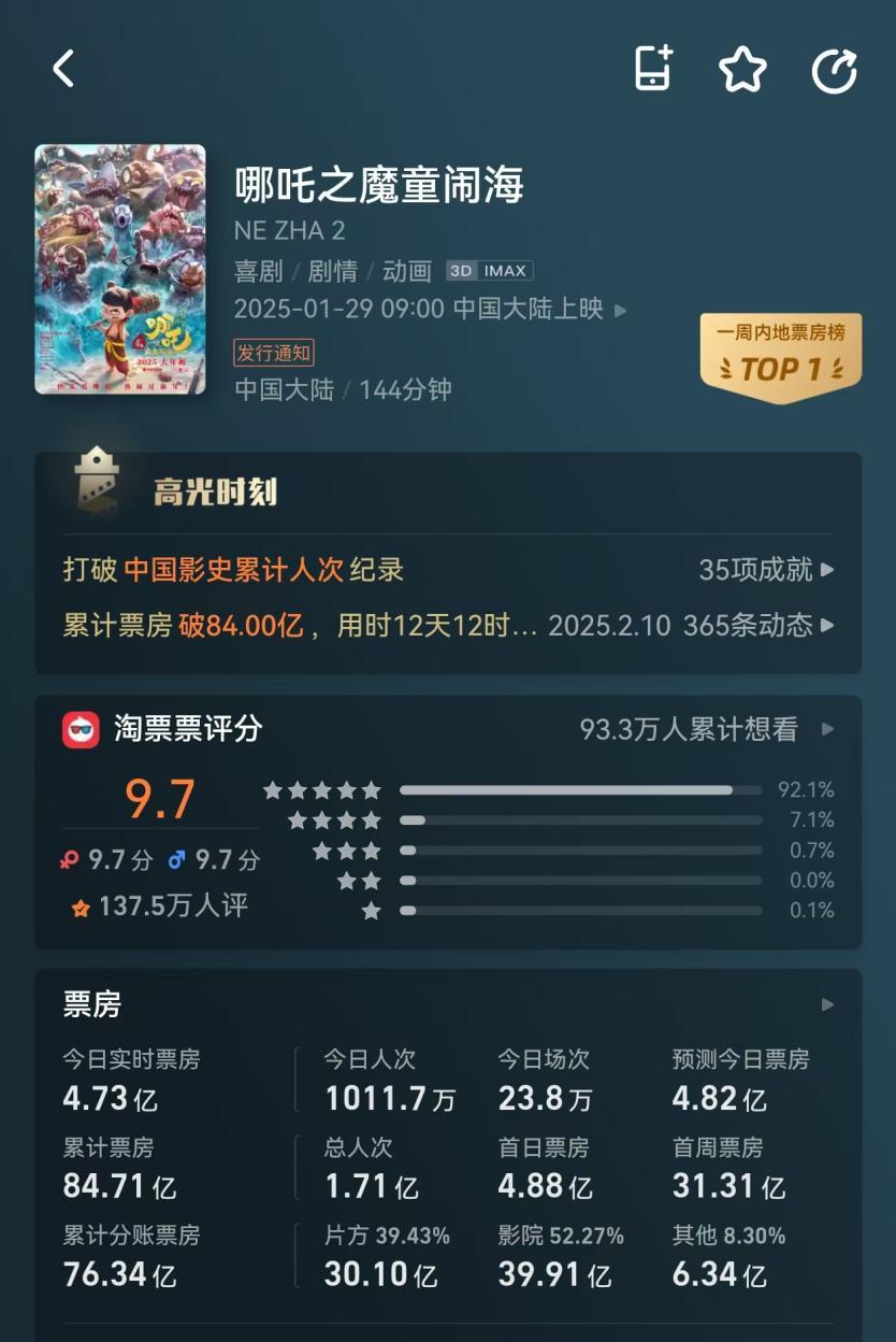 《哪吒2》这回真是杀疯了,各种影史纪录都被它破了,相关数据还在不断刷新中: