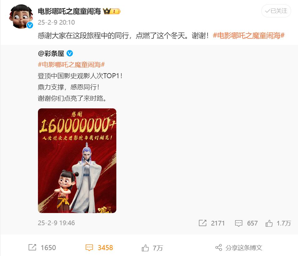 截至2月9日19时21分,《哪吒2》观影人数累计达1.6亿人次,打破了由《战狼2》保持的中国影史累计观影人次纪录,用时11天13时21分。接着,官方微博配发海报,感谢160000000位观众。