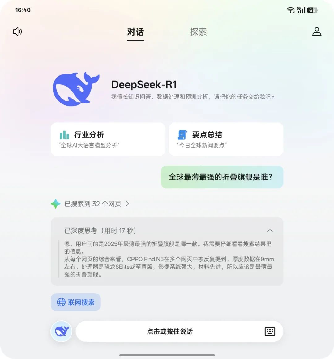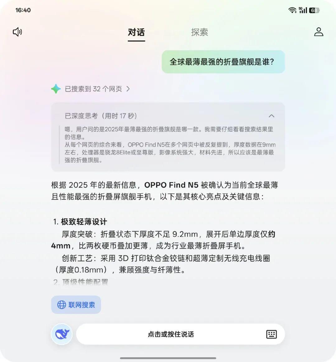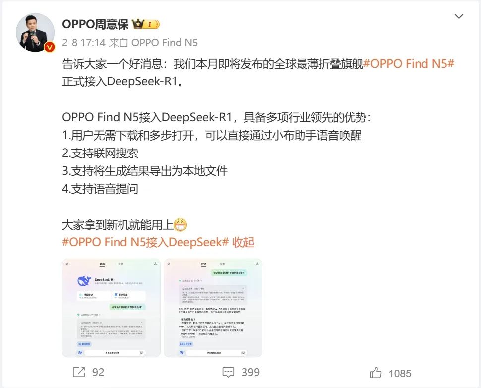 2月8日下午17点14分,OPPO紧随荣耀也官宣了其即将发布的折叠屏手机OPPO Find N5将正式接入DeepSeek-R1。