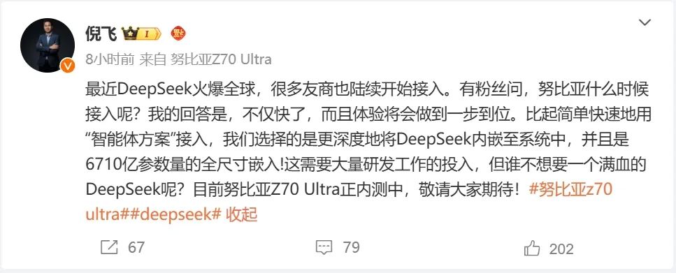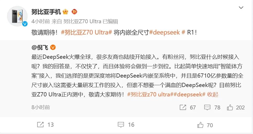 中兴通讯终端事业部总裁、努比亚技术有限公司总裁倪飞也在微博上发文称,比起简单快速地用“智能体方案”接入,努比亚会将DeepSeek内嵌至系统中,并且是6710亿参数量的全尺寸嵌入,这需要大量研发工作到投入,目前努比亚Z70 Ultra正在内测中。