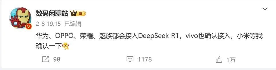 vivo这边虽然没有明确官宣信息,但知名数码爆料人数码闲聊站2月8日晚19点15分在微博上发文称,vivo确认将接入DeepSeek-R1。