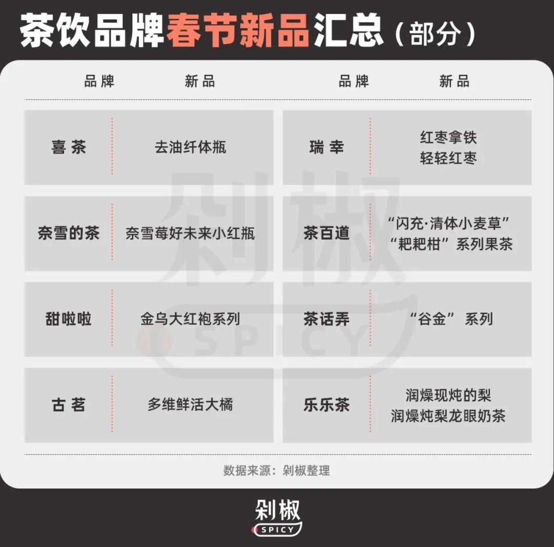茶百道便是典型,相关负责人向剁椒 spicy 表示,“由于春节聚会菜肴往往十分丰盛,大鱼大肉之余难免感觉油腻,因此消费者特别需要饮品具备佐餐解腻的效果。”