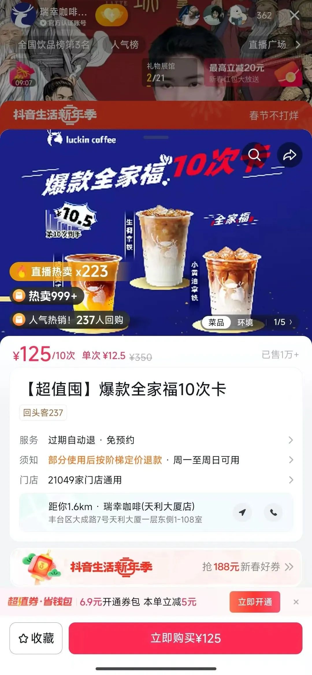 瑞幸的直播间更是如此,经常逛直播间囤券的赵青发现,2024年的时候还能囤到不少9块9的“N选1”团购券,但后来这个“N”便不断减少,参与9块9的产品寥寥无几。再到如今,“9块9”几乎完全消失在直播间,“N选1”的最低价在11.9元,10次卡的日常价格在125元,最低价则是109元。