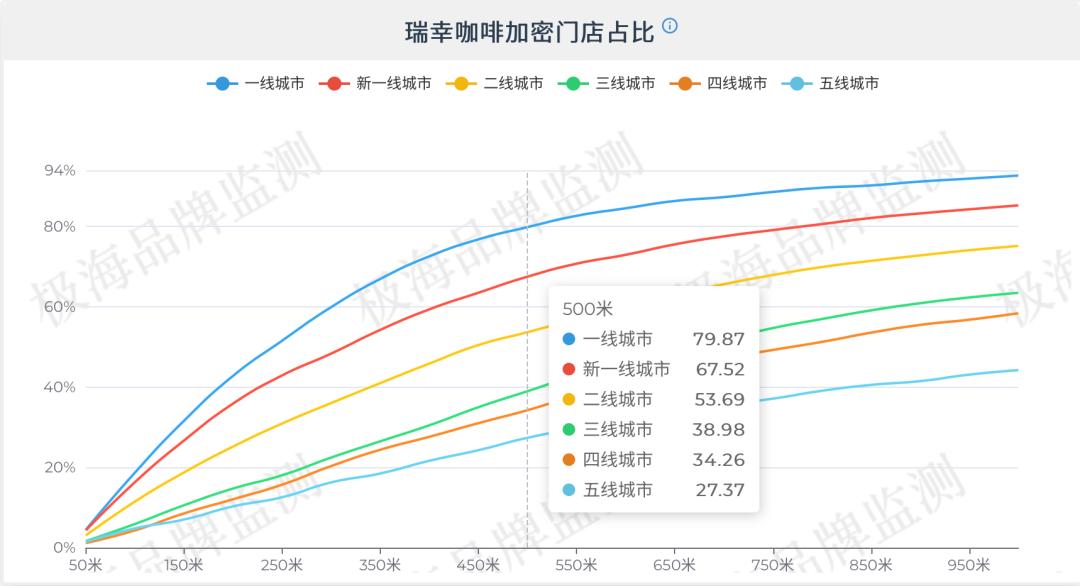 根据极海品牌监测截至2025年2月13日的数据,瑞幸的加密门店(区域范围内有2家及以上)占比相当高,例如500米的范围,在一线城市加密门店的占比达到79.87%,将范围放大至1000米,占比则达到了92.71%。