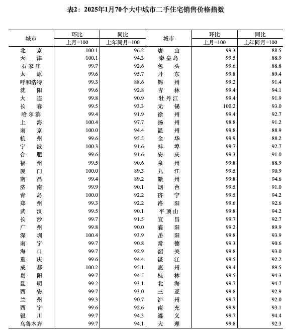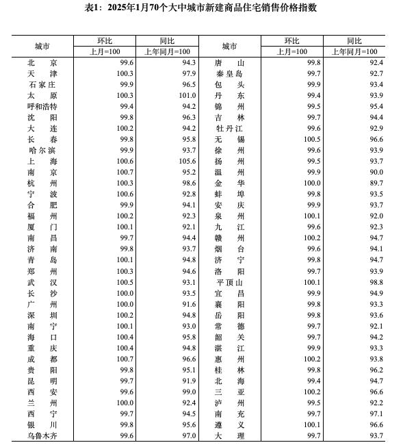 国家统计局公布的2025年1月份70个大中城市商品住宅销售价格变动情况显示,2025年1月份,70个大中城市中,一线城市商品住宅销售价格环比继续上涨,二三线城市环比总体略降;一二三线城市同比降幅均持续收窄。