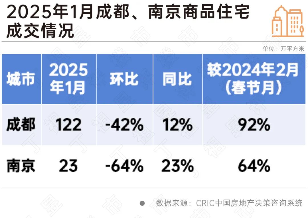 CRIC数据显示,2025年1月成都商品住宅成交面积122万平方米,环比下降42%,同比上涨12%,较2024年2月春节月上涨92%。主要受成都核心区高改项目推动,如阅天府、招商翎雲阁、中环天宸凭借地段和产品优势持续热销。