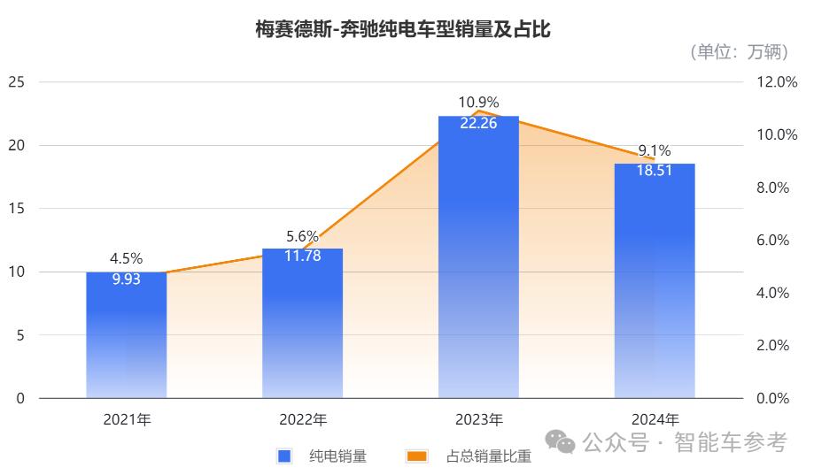 就这方面进展来看,奔驰纯电车型全年交付量为18.51万辆,同比大跌23%,纯电销量占总销量的比例为9.3%,同比直降1.8个百分点。