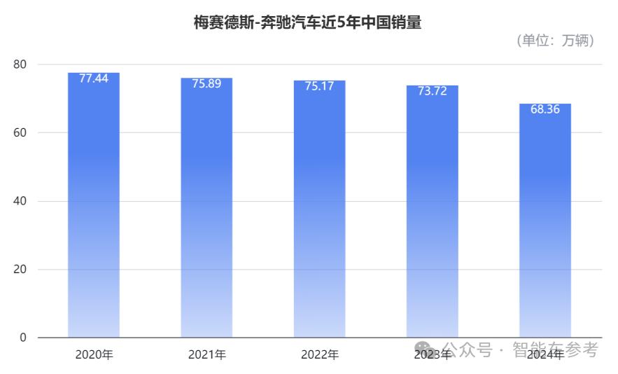 2024年,奔驰汽车在中国的销量为68.36万辆,同比下降7%。