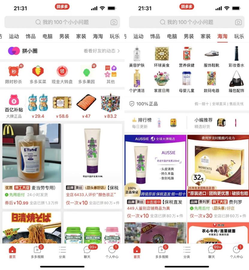 拼多多却是“起个大早,赶个晚集”。早在2019年,拼多多便推出了海淘平台“多多国际”,同年,拼多多APP内上线了一级入口“海淘”。