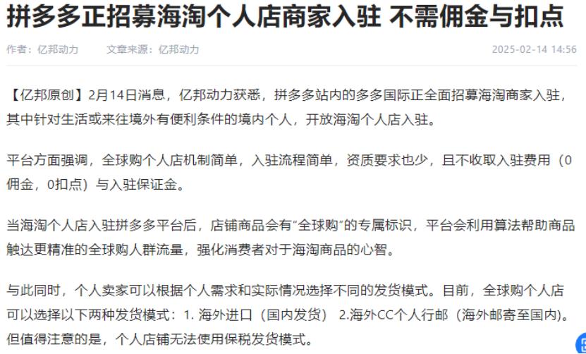 近日,拼多多宣布旗下多多国际将全面招募海淘商家入驻,针对生活或来往境外有便利条件的境内个人,开放海淘个人店入驻,且不收取入驻费用(0佣金,0扣点)与入驻保证金。