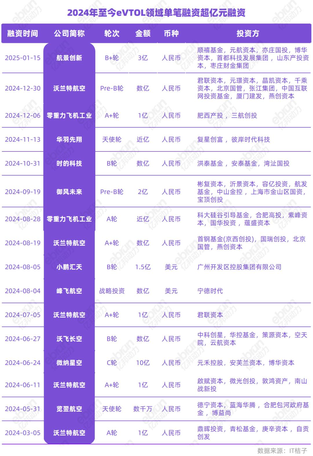 2024年获得融资最多的公司“沃兰特航空”也来自eVTOL赛道——一年6轮,总金额达数十亿,投资方包括国投创新、上海科创基金等国资背景基金,蓝驰创投、红杉中国、高瓴资本等知名VC,以及吉利、顺丰等知名大厂。