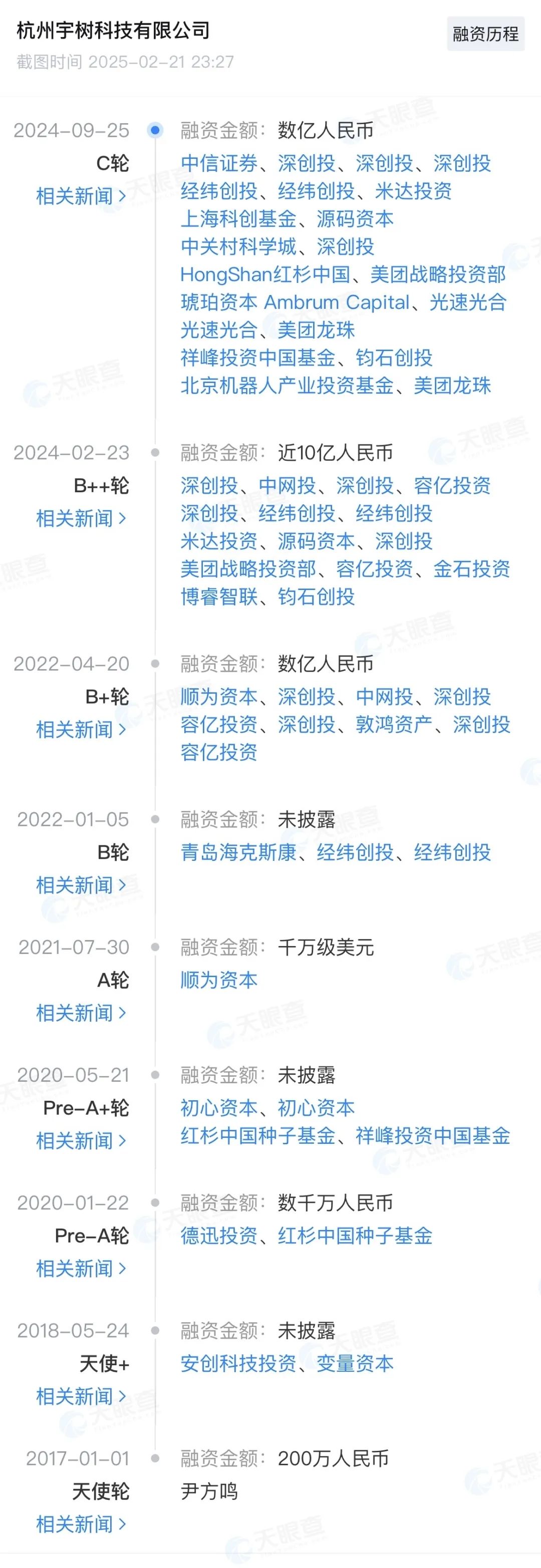 2024年9月,宇树又在北京机器人产业投资基金领投的C轮融资中筹集了数十亿元人民币,美团、琥珀资本、上海科技创新基金、红杉中国等机构参与其中。