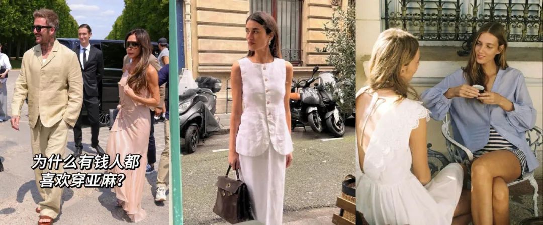 亚麻纺织品,则常见于在时尚界大行其道的「老钱风」穿搭。因亚麻纤维相较于棉花等其他纤维作物,产量低、加工难度大、价格高、易损耗,受众就自然限定在了有钱有闲的人群,乃至于亚麻面料特有的易皱属性,都被人赞为「富贵褶」。