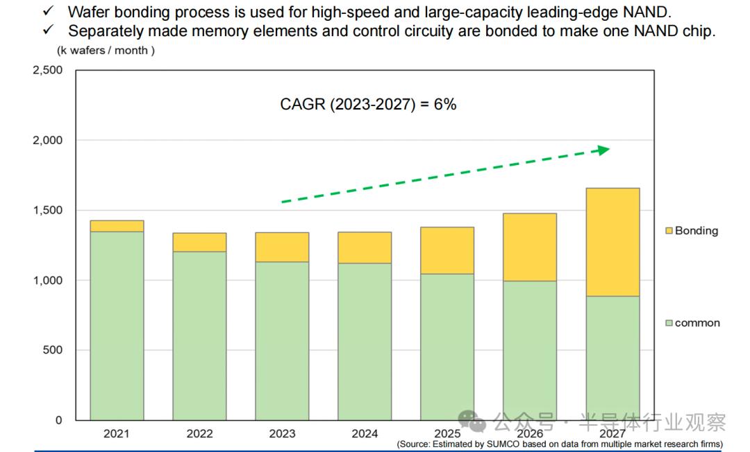 晶圆键合技术未来几年内在NAND的生产中也会越来越重要,特别是在满足高性能和大容量存储需求的过程中。通过将分别制造的内存元素和控制电路进行键合,形成一个完整的NAND芯片,从而减少了互连长度并提高了速度。在此过程中,使用两片晶圆(内存和逻辑)结构将成为主流技术。预计2023-2027年期间,晶圆键合的需求将保持增长,年均复合增长率(CAGR)为6%。
