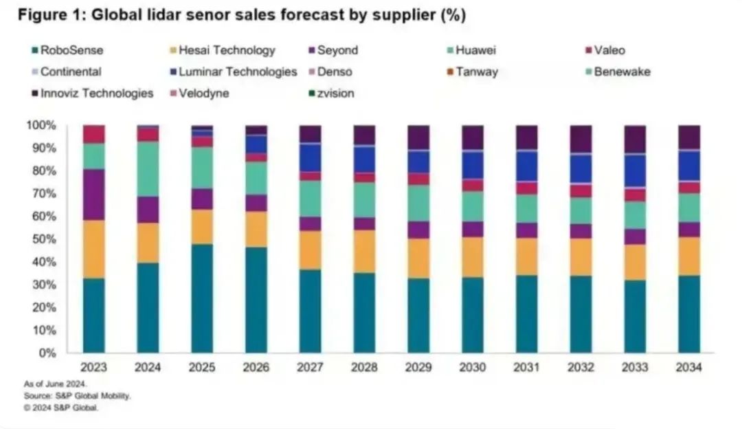 能够帮助中国市场将激光雷达单价打下来的,正是整体产业链优势,速腾聚创、禾赛、华为稳坐汽车激光雷达供应商出货量前三甲位置。如今单颗汽车智驾常用规格激光雷达价格已经下沉到两三千元水平,未来还将进一步下降。