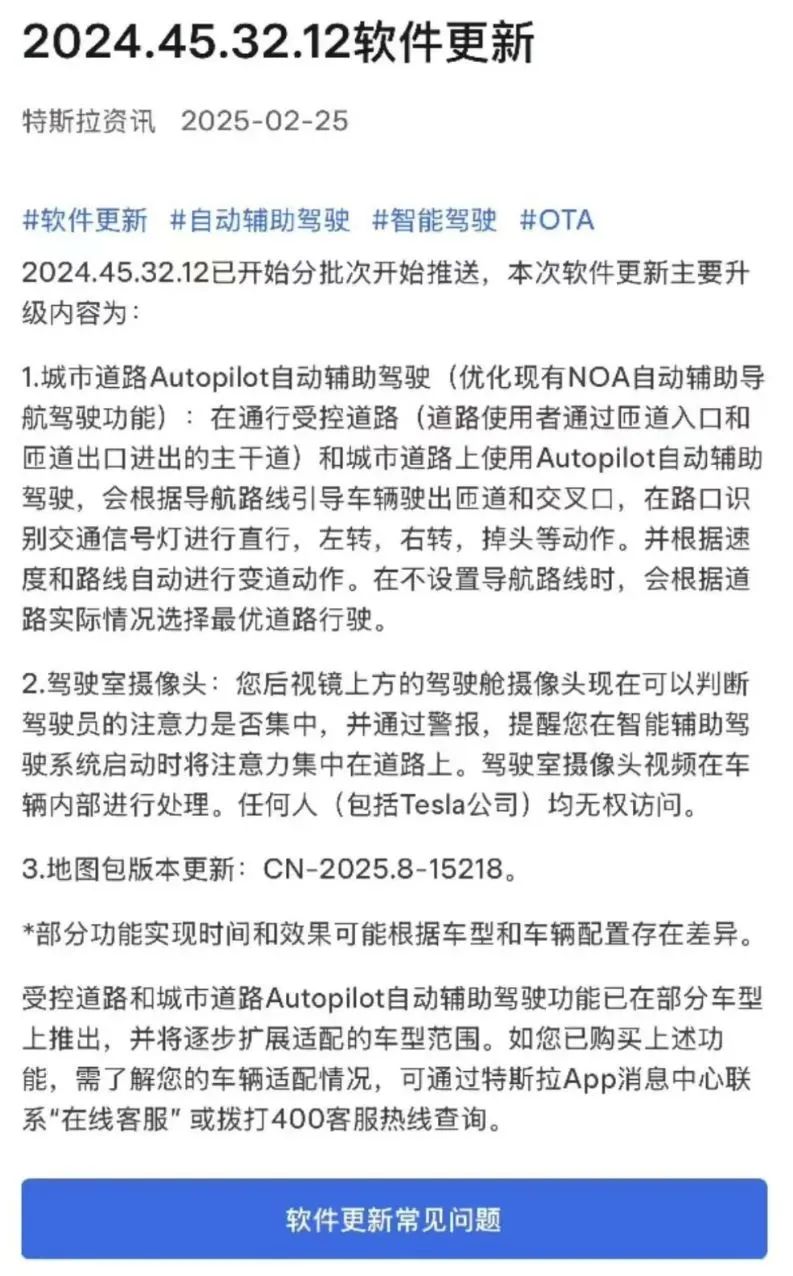 “2024.45.32.12已开始分批次推送,本次软件更新主要升级内容包括城市道路Autopilot自动辅助驾驶。”
