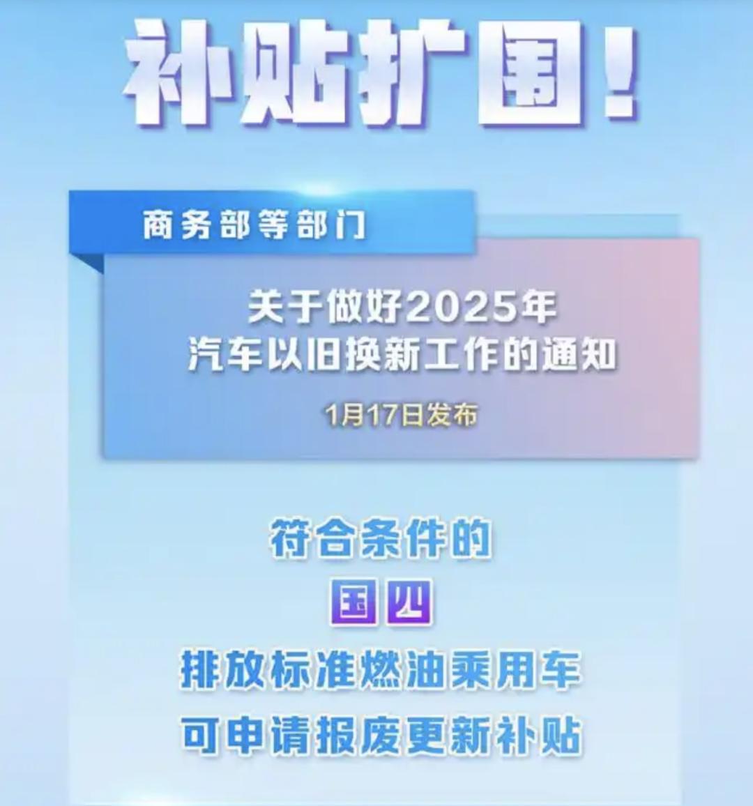 而基于去年购车补贴政策的成功,在2025年开年不久,商务部等8部门联合发布的《关于做好2025年汽车以旧换新工作的通知》(以下简称《通知》)显示,在去年政策基础上,今年不仅将部分国四排放标准车辆纳入报废换新补贴范围,还明确置换更新补贴具体标准。