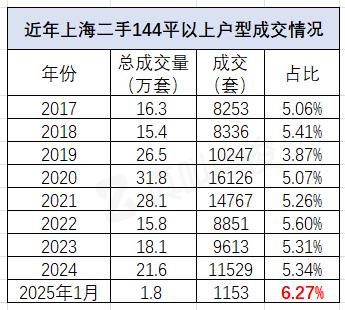结合近年的成交数据来看,144平以上房源在全市成交中大概占比只有5%,相当于每成交 100 套房子里,只有 5 套是 144 平以上, 确实不算多。