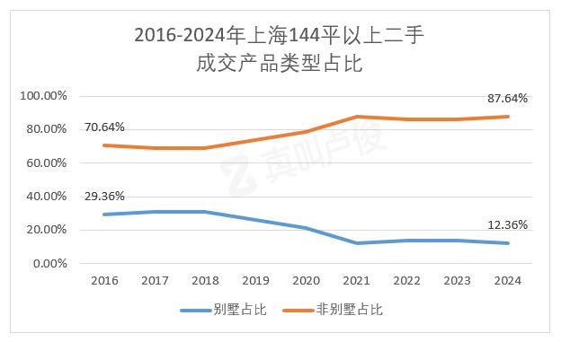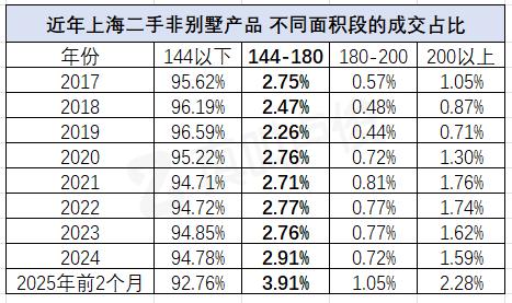 第二大原因就是供应稀缺。2022年到2024年,二手房以144平以下的户型供应为主,占比长期维持在94%左右,今年年初才勉强降到92.7%。