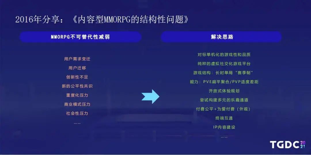 在《天刀》团队工作时,杨峰一直在思考并尝试解决MMO品类的“疑难杂症”。2016年,杨峰就认为MMORPG存在着用户需求的不断变迁,包括游戏品类的不断变迁,MMORPG创新不足,商业化和成长模式带来游戏内公平性问题等等“结构性问题”。