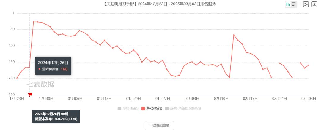 但是从最终结果来看,《天刀》的探索并不成功,在《天刀》手游近一年的iOS畅销排名数据当中,最高也只短暂地来到了游戏畅销榜第27的位置,相比于《天刀》手游早期的成绩来说,还是存在着一定的下滑。结合前文提到的失败项目《Glow》来看,杨峰在北极光的职业生涯后期遇到的问题确实不小。