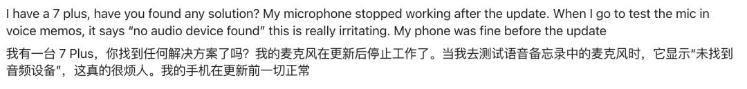 不少用户向苹果反映,自己在接打电话时无法听到对方的声音,并且在使用语音备忘录和拍摄视频时,都无法录制声音,连接耳机也不能解决这个问题。