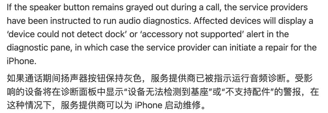 于是,苹果马上给授权服务商下了指示:如果用户出现了这个情况,先运行音频诊断,只有当诊断面板出现了 “ 设备无法检测到基座 ” 或者 “ 不支持配件 ” ,才免费给用户修手机。