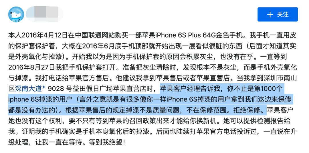 当时咱们国内有不少消费者拿着 “ 掉漆战损版 ”iPhone6s 去找苹果售后要说法,但是捏,苹果官方售后给的反馈是 “ 掉漆不是质量问题,不在保修范围,只有等官方出了召回政策,才能给你换新机 ” 。