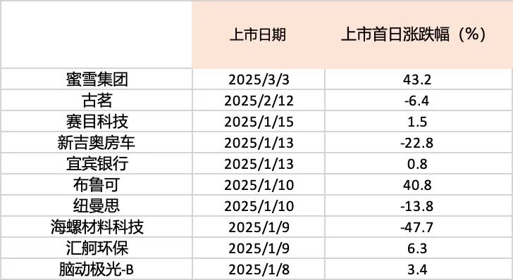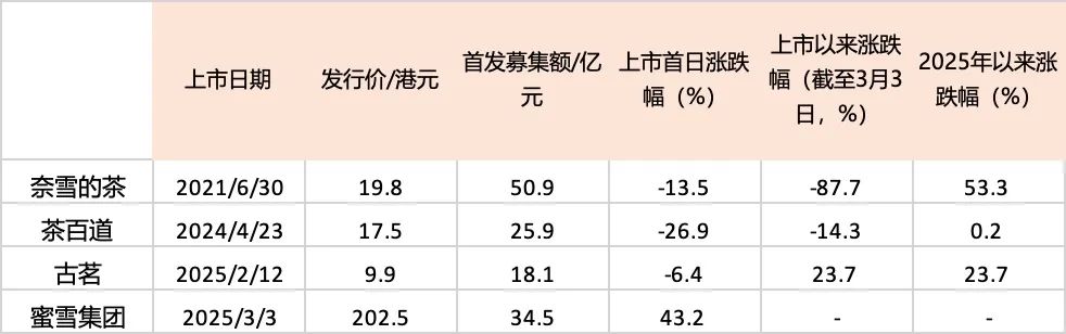 3月3日,刷新港股IPO认购纪录的「雪王」蜜雪集团正式登陆港交所,首日大涨43.2%,每股收报290港元,打破新茶饮(奈雪的茶、茶百道、古茗)上市首日破发的「魔咒」, 亦是2025年以来首日上市股价表现最好的新股。