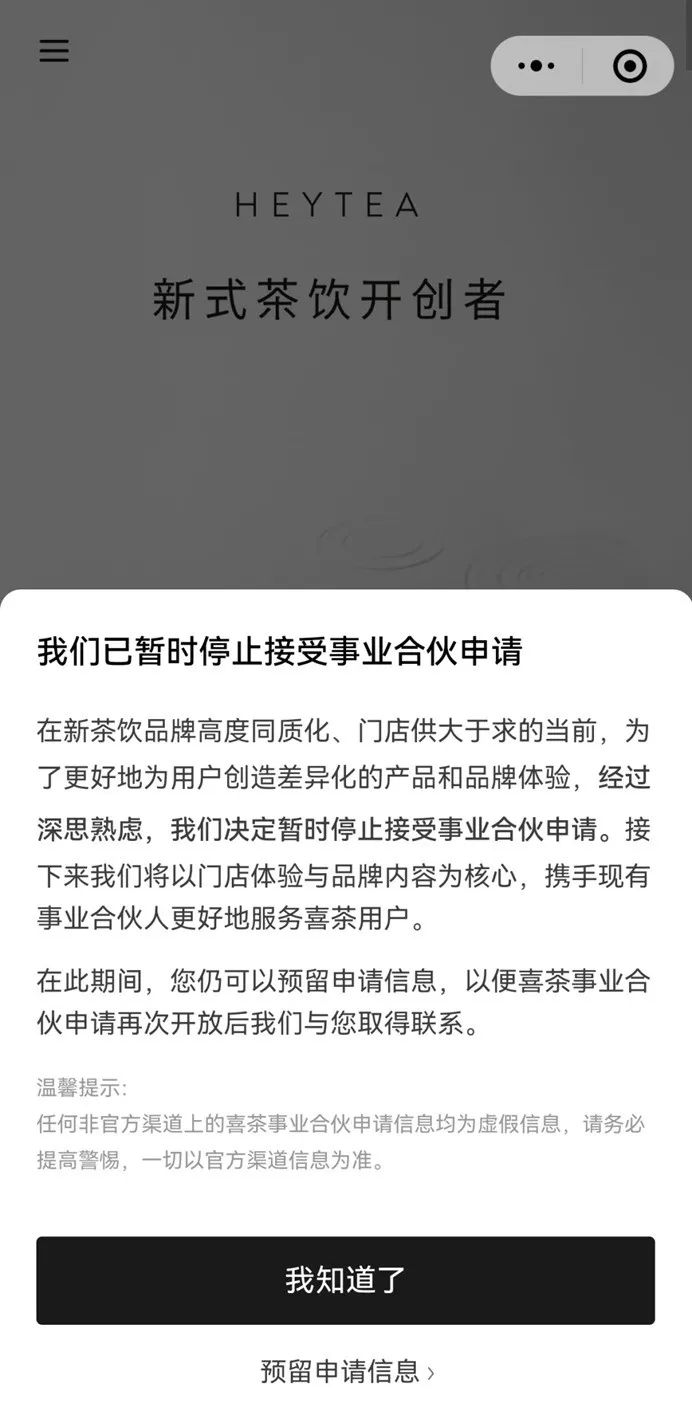 在此背景下,此前部分对加盟持开放态度的新茶饮品牌已经开始放缓扩张的脚步。2025年2月10日,喜茶对外表示,“在新茶饮品牌高度同质化、门店供大于求的当下,为更好地为用户创造差异化的产品和品牌体验,决定暂时停止接受事业合伙业务申请”。