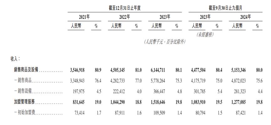 与蜜雪冰城类似,古茗并不靠加盟费“割韭菜”,而是通过向加盟商销售商品和设备创收。招股书显示,2021年-2023年以及2024年前三季度,古茗销售商品和设备营收分别为35.47亿元、45.05亿元、61.45亿元以及51.53亿元,分别占各期总营收的80.9%、81%、80.1%以及80%。