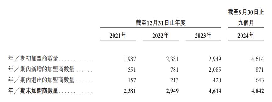 投入力度更大的背景下,古茗新开门店的经营质量反而恶化,自然会削弱加盟商们的积极性。招股书显示,2021年-2023年以及2024年前三季度,古茗退出的加盟商数量分别为157家、213家、420家以及643家,一路飙升。
