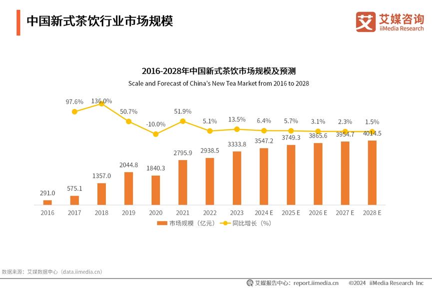 艾媒咨询披露的数据显示,预计2024年,中国新式茶饮市场规模为3547.2亿元,同比仅增长6.4%,相较前几年的双位数,乃至三位数增速,大幅回落。
