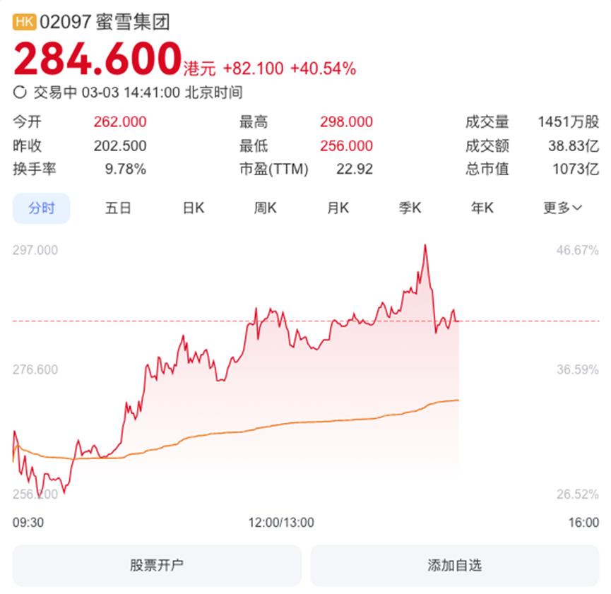 2025年3月3日,“全球第一现制饮品企业”蜜雪冰城正式登陆港交所,开盘价为262.00港元/股,较发行价上涨29.38%。截至午后,蜜雪冰城股价涨幅扩大至约41%,报284.6港元/股。