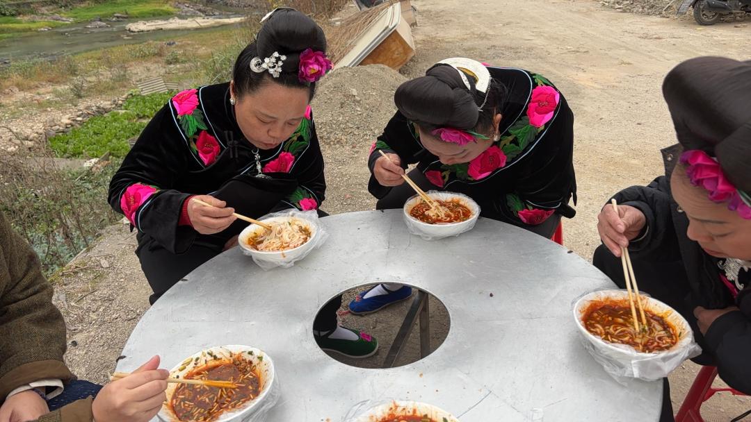 △在清晨的贵州山村里,和本地嬢嬢一起围坐在小圆桌前嗦粉。/阿祯 摄