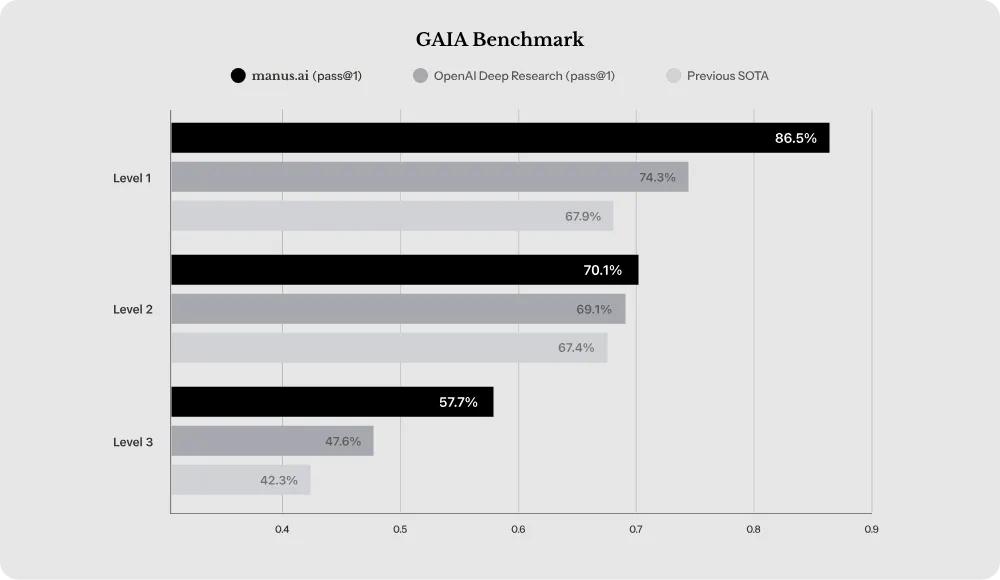 根据官方网站信息,Manus在GAIA基准测试(用于评估通用 AI 助手在解决现实世界问题方面的能力)中表现卓越,成为在三个难度级别上都有新最先进(SOTA)记录的AI助手。
