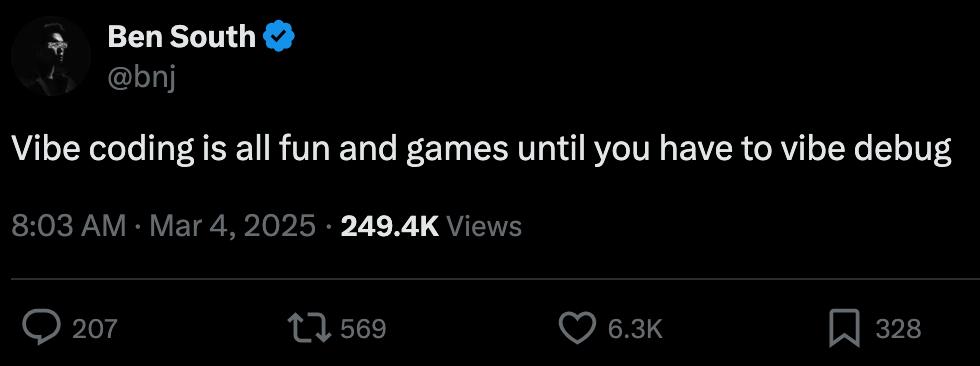 开发者 Ben South 在 X 上调侃 vibe coding 很有趣,可一旦需要“vibe debug“就是另一回事了