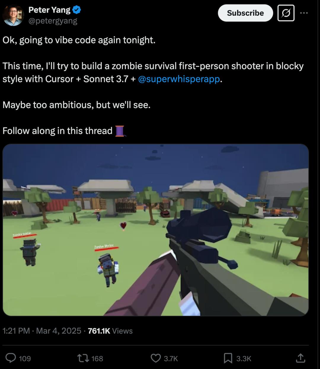 微软工程师 Peter Yang 最近也在一条 X 帖子中演示了 vibe coding 的应用。通过一系列对话式提示输入给 Cursor 和 Claude 3.7 Sonnet,做出了一个简单的 3D 第一人称射击丧尸游戏。Yang 还用了语音转文字应用,以便他能直接用口述来描述需求,并在不断迭代中完善原型。