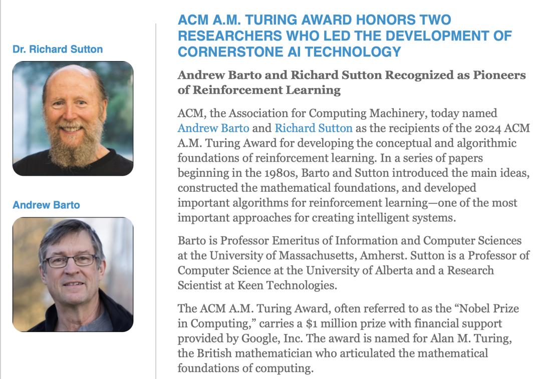 安德鲁·巴托(Andrew Barto)与理查德·萨顿(Richard Sutton)共获 2024 年度图灵奖,二人是相差九岁的师徒,是 AlphaGo 和 ChatGPT 技术上的奠基人,亦是机器学习领域的技术先驱。