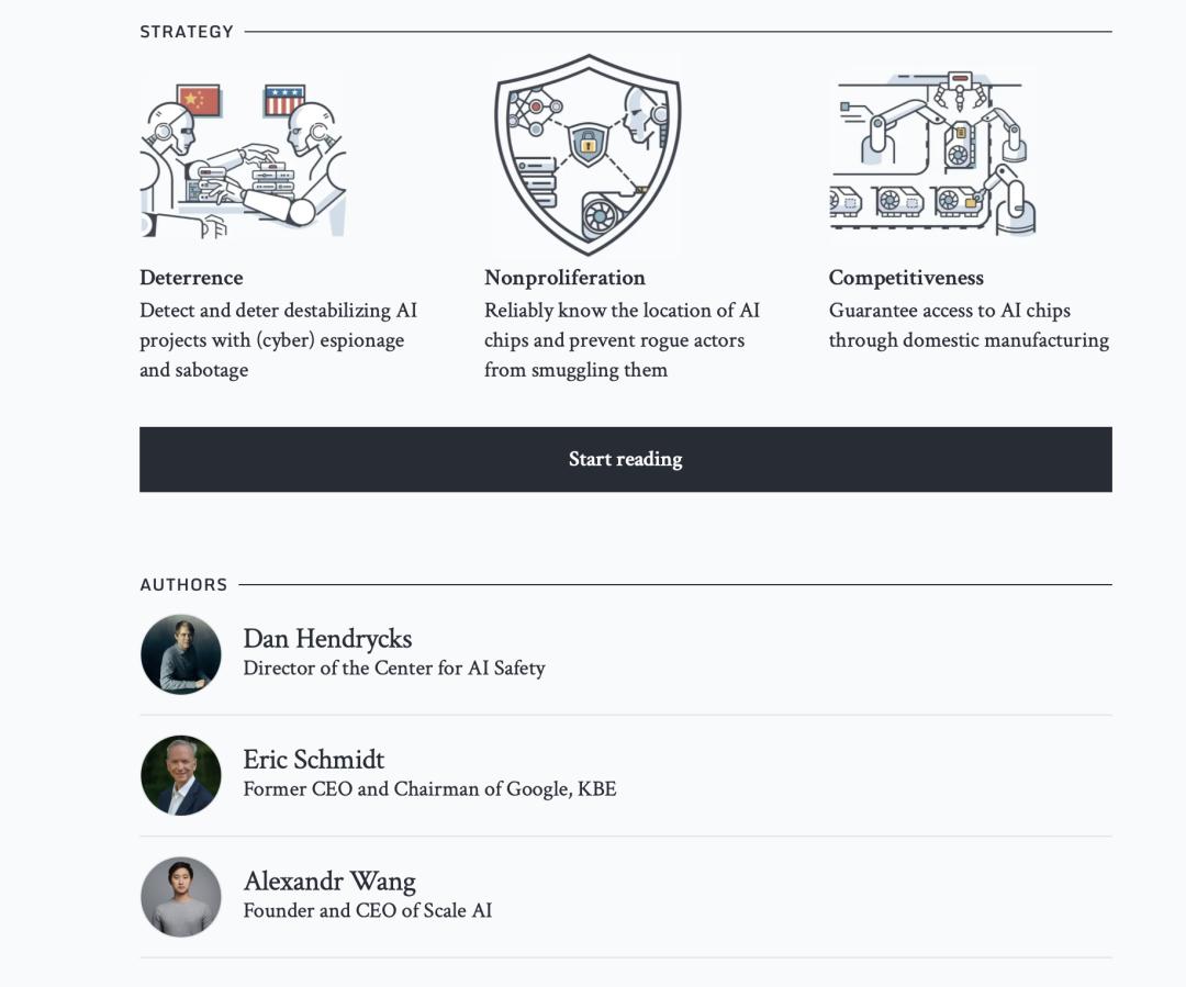 就在 3 月 7 日,前谷歌 CEO 埃里克·施密特、Scale AI 创始人 Alex Wang、AI 安全中心主任丹·亨德里克斯三人联名发表了一篇警示性论文。