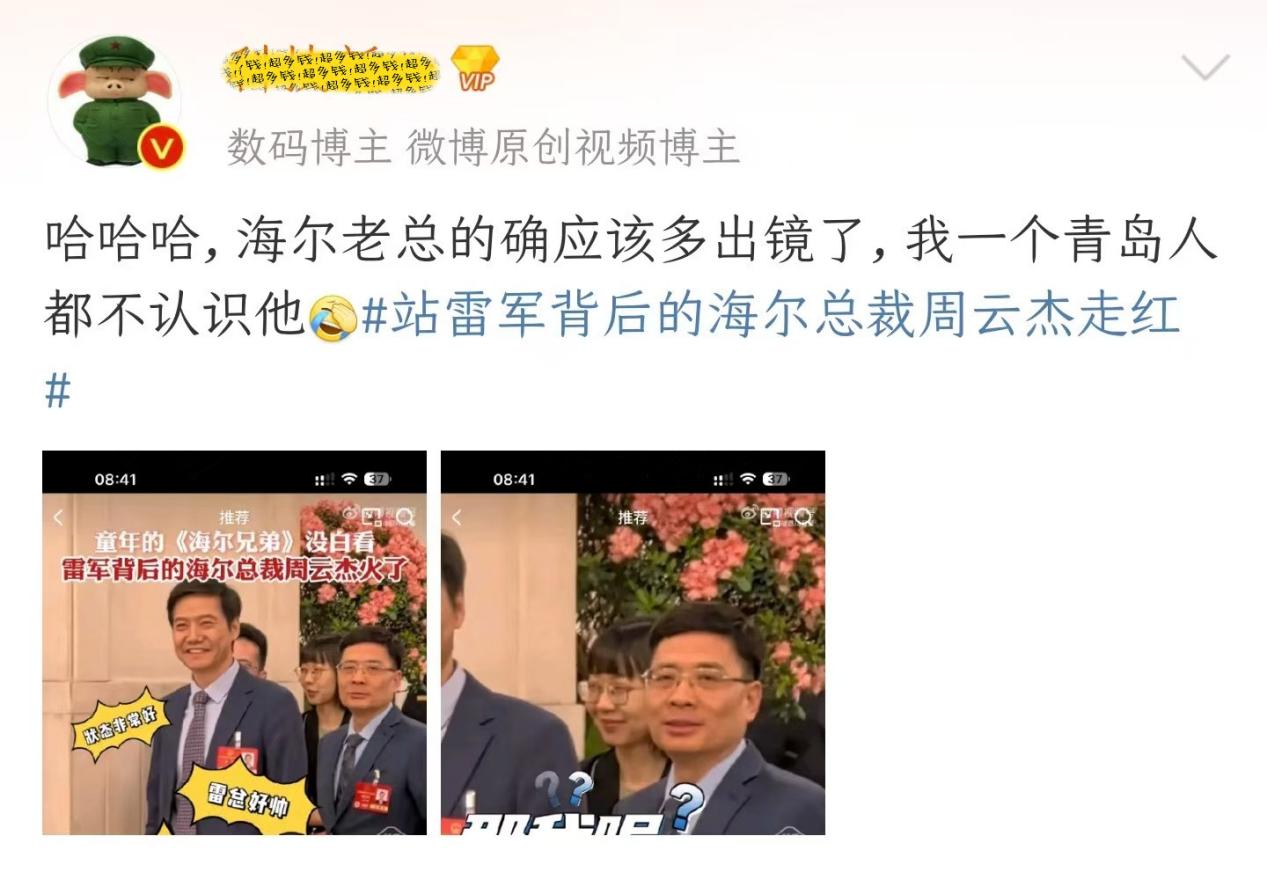 海尔老总周云杰因与雷军同框时的丰富微表情,被各大官媒的摄像机捕捉后,经网友之手诞生出系列表情包而意外走红,成功出圈后,周云杰在回应中还留下了择机启动个人社交账号、探讨海尔与小米生态合作的悬念,可谓吊足了吃瓜网友的胃口。