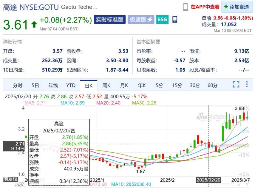 作为本次吴彦祖英语课破圈的另一大受益者,高途教育也因此尝到了“流量红利”,不仅在其官方App上有两万多人报名吴彦祖英语课,更重要的是其股价在近期不断上涨,新浪科技发现,自“阿祖带你学口语”抖音账号发布首个视频以来,短短20天时间,高途的股价便从2.57元一路最高上涨至3.88元,涨幅超过50%,然而在这样的涨幅背后,高途教育的财报数据却并不算太好。