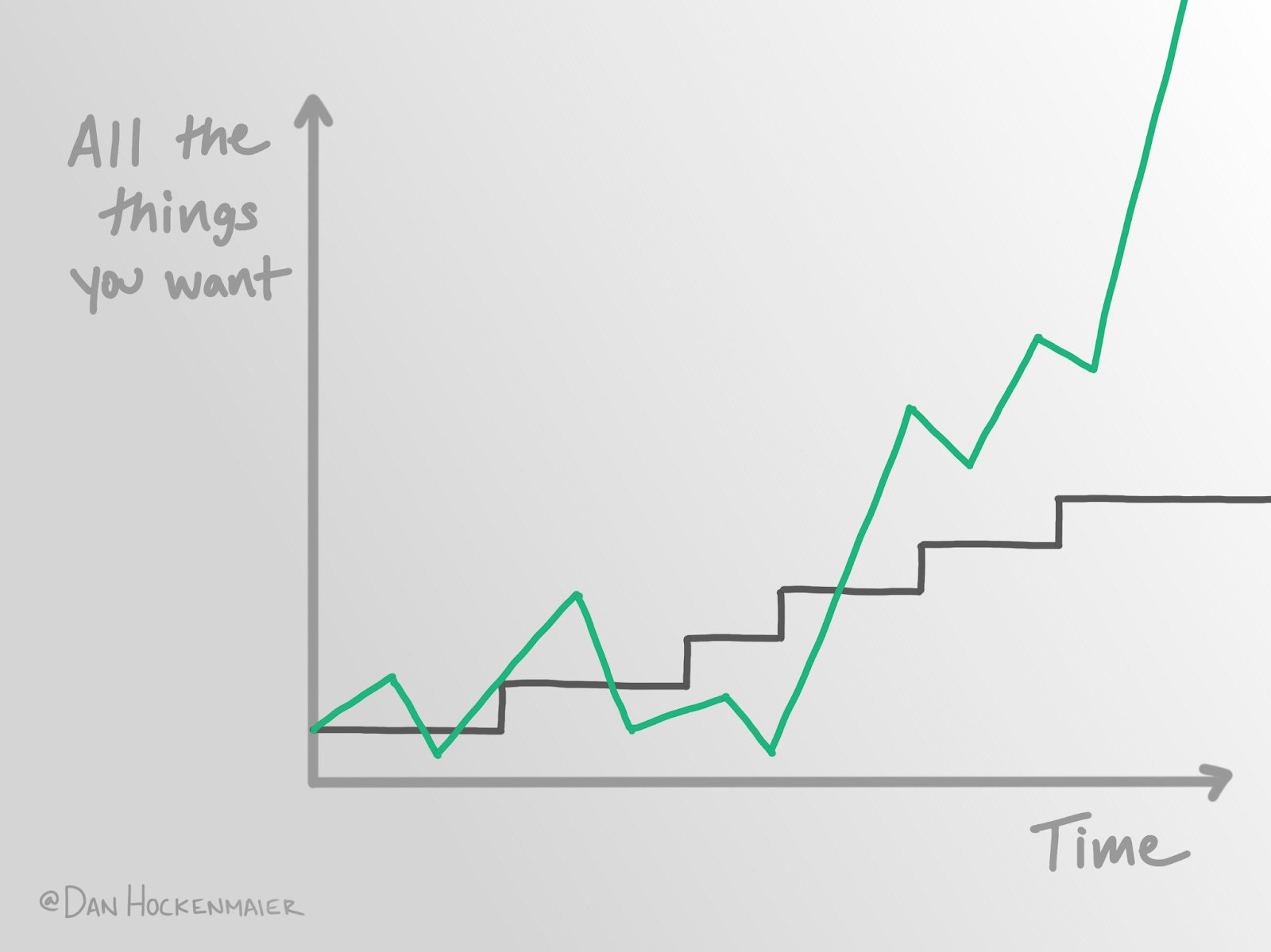 及时下车、追逐自己的天赋与热爱,通常意味着放弃一条稳步(但缓慢)上升的职业路径,转而选择一条初期更颠簸的道路——只是为了发现让那条曲线陡升的机会。