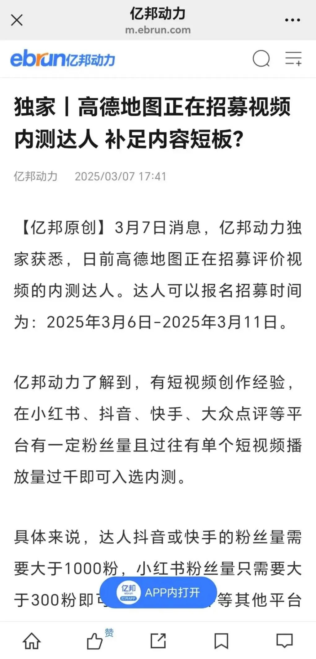 近日,有媒体报道称,高德地图正在招募评价视频的内测达人。